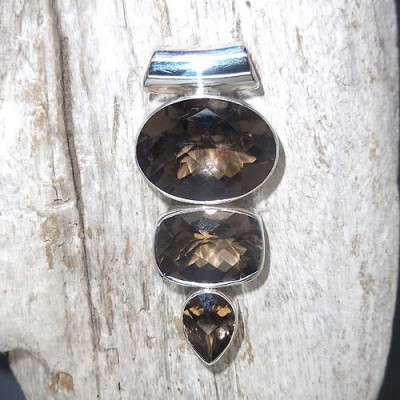 3 funkelnde, durchscheinende Rauchquarze in verschiedenen Formen, die alle im Schachbrettschliff geschliffen sind. Silberkette, Reif, Kautschukband o.ä. wird durch die Röhre gefädelt, wodurch der Anhänger mehr in die Kette integriert ist, was harmonisch und edel aussieht. Fassung und Röhre sind aus 925er Sterling Silber gearbeitet. Die Röhre hat einen Durchmesser von 5mm und ist geeignet für Ketten mit einem Durchmesser bis zu 4mm. Gesamtlänge des Anhängers: 4,2cm. Steingrössen: 14 x 18mm, 10 x 15mm, 7x10mm. Gewicht: 9,6g